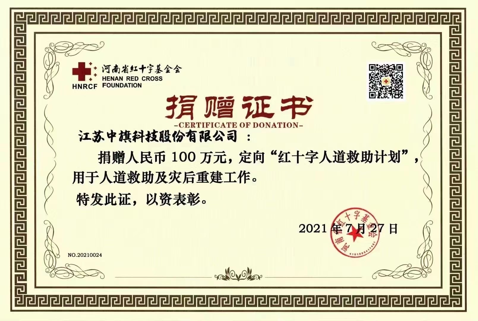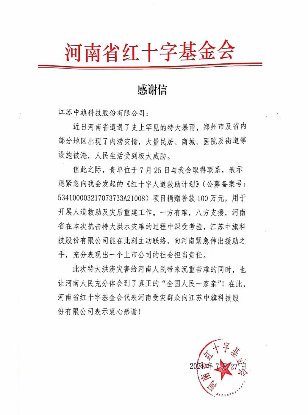 2021年7月河南遭遇了罕見的暴雨洪災,牽動著全國人民的心。中旗科技心系災區,經董事會決議通過向河南省紅十字基金會捐贈100萬元,定向“紅十字人道救助計劃”,用于河南省人道救助及災后重建工作。
